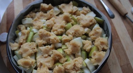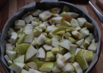 Разогрейте духовку до 180С. Форму 20 см застелите бумагой для выпечки. Смешайте муку, сахар, масло, яйцо и ванилин. 3/4 теста выложите в форму, разровняйте. Сверху выложите кусочки груши, нарезанные кубиками. Затем оставшееся тесто порвите на кусочки и уложите их поверх груши. Посыпте корицей и ванильным сахаром. Выпекать 40-50 минут.
