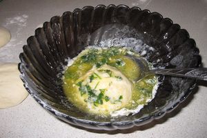 Сделать «соус»: чеснок почистить и пропустить через пресс, зелень мелко покрошить, соединить с чесноком и растопленным сливочным маслом, добавить немного соли по вкусу.